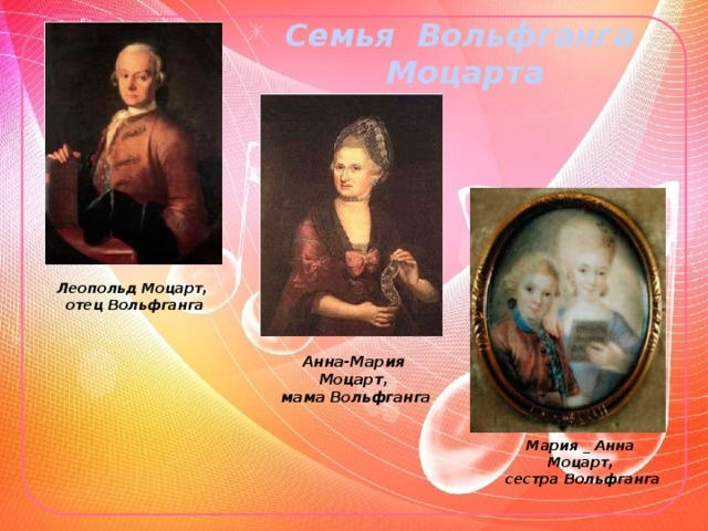 Ранние годы Моцарт (Иоганн Хризостом Вольфганг Теофил (Готтлиб) Моцарт) родился 27 января 1756 года в городе Зальцбург в музыкальной семье. В биографии Моцарта важно отметить, что музыкальный талант великого композитора был обнаружен еще в раннем детстве. Отец обучал его игре на органе, скрипке, клавесине. В 1762 году семейство едет в Вену, Мюнхен. Там даются концерты Моцарта, его сестры Марии Анны. Затем во время путешествий по городам Германии, Швейцарии, Голландии музыка Моцарта поражает слушателей удивительной красотой. Впервые сочинения композитора издаются в Париже.