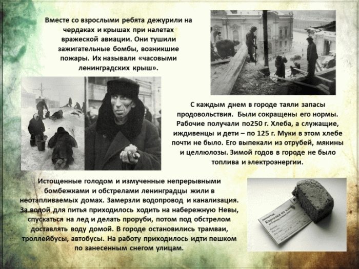 Сколько бы лет ни прошло, мужество ленинградцев – это образец мужества, подвига, стойкости, несгибаемой воли к победе. В ходе мероприятия, библиотекарь рассказала ребятам о тяжелых днях войны, о детях, которые жили в блокадном Ленинграде, о записях в дневнике Ленинградской школьницы Тани Савичевой, её семье и жизни до войны, о том, как постепенно девочка теряла близких и осталась одна во время блокады. Так же ребята узнали о «Дороге жизни» через Ладожское озеро. Большое впечатление на детей произвёл рассказ о норме хлеба, о том, что значили в то время хлебные карточки.