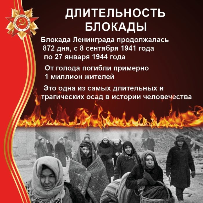 Блокада Ленинграда длилась с 8 сентября 1941 года по 27 января 1944 года (872 дня). Некоторые факты о блокаде: Блокадное кольцо вокруг Ленинграда сомкнулось после захвата немецкими войсками Шлиссельбурга. Кольцо блокады было прорвано 18 января 1943 года в ходе операции «Искра». Несмотря на голод и обстрелы, город продолжал бороться: заводы не прекращали работу, выпускали военную продукцию, работали библиотеки, театры.