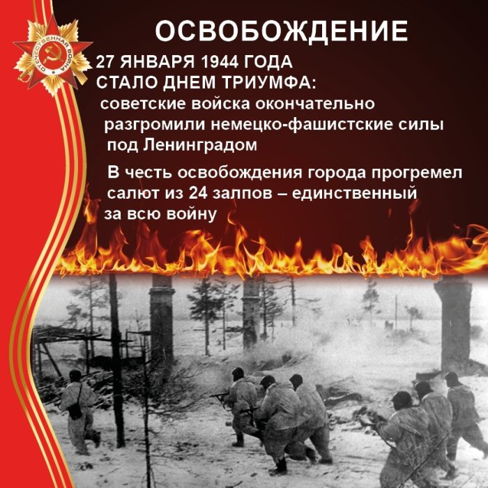 27 января 1944 года полностью был освобожден Ленинград от фашисткой блокады, которая продолжалась почти 900 долгих дней и ночей, 900 дней смерти, голода, холода, бомбежек, отчаяния и мужества жителей Северной столицы. Эти дни и ночи навсегда останутся трагической, героической и победной страницей истории нашего народа.