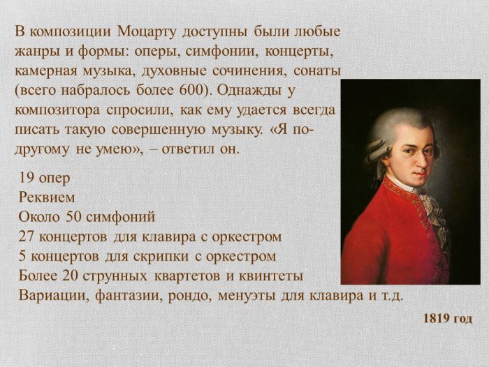 Для Моцарта произведения того времени оказались чрезвычайно успешными. «Волшебная флейта», «Милосердие Тита» – эти оперы были написаны быстро, однако весьма качественно, выразительно, с красивейшими оттенками. Известная месса «Реквием» так и не была закончена Моцартом. Произведение закончил ученик композитора – Зюсмайер.